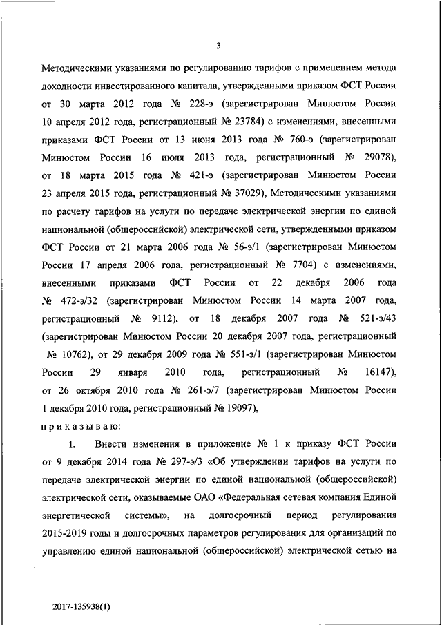 "О ВНЕСЕНИИ ИЗМЕНЕНИЙ В ПРИЛОЖЕНИЕ N 1 И ПРИЛОЖЕНИЕ N 2 К ПРИКАЗУ ФЕДЕРАЛЬНОЙ СЛУЖБЫ ПО ТАРИФАМ ОТ 9 ДЕКАБРЯ 2014 Г. N 297-Э/3 "ОБ УТВЕРЖДЕНИИ ТАРИФОВ НА УСЛУГИ ПО ПЕРЕДАЧЕ ЭЛЕКТРИЧЕСКОЙ ЭНЕРГИИ ПО ЕДИНОЙ НАЦИОНАЛЬНОЙ (ОБЩЕРОССИЙСКОЙ) ЭЛЕКТРИЧЕСКОЙ СЕТИ, ОКАЗЫВАЕМЫЕ ОАО "ФЕДЕРАЛЬНАЯ СЕТЕВАЯ КОМПАНИЯ ЕДИНОЙ ЭНЕРГЕТИЧЕСКОЙ СИСТЕМЫ", НА ДОЛГОСРОЧНЫЙ ПЕРИОД РЕГУЛИРОВАНИЯ 2015 - 2019 ГОДЫ И ДОЛГОСРОЧНЫХ ПАРАМЕТРОВ РЕГУЛИРОВАНИЯ ДЛЯ ОРГАНИЗАЦИЙ ПО УПРАВЛЕНИЮ ЕДИНОЙ НАЦИОНАЛЬНОЙ (ОБЩЕРОССИЙСКОЙ) ЭЛЕКТРИЧЕСКОЙ СЕТЬЮ НА 2015 - 2019 ГОДЫ"