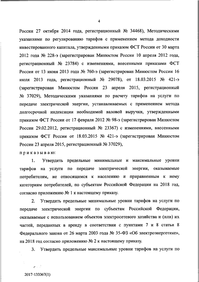 "ОБ УТВЕРЖДЕНИИ ПРЕДЕЛЬНЫХ МИНИМАЛЬНЫХ И МАКСИМАЛЬНЫХ УРОВНЕЙ ТАРИФОВ НА УСЛУГИ ПО ПЕРЕДАЧЕ ЭЛЕКТРИЧЕСКОЙ ЭНЕРГИИ, ОКАЗЫВАЕМЫЕ ПОТРЕБИТЕЛЯМ, НЕ ОТНОСЯЩИМСЯ К НАСЕЛЕНИЮ И ПРИРАВНЕННЫМ К НЕМУ КАТЕГОРИЯМ ПОТРЕБИТЕЛЕЙ, ПО СУБЪЕКТАМ РОССИЙСКОЙ ФЕДЕРАЦИИ НА 2018 ГОД"
