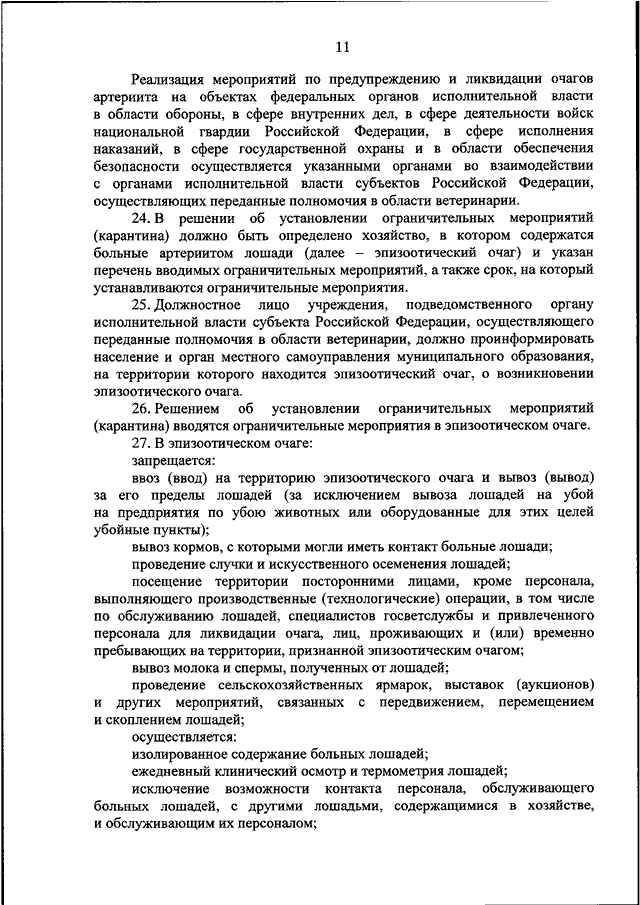 "ОБ УТВЕРЖДЕНИИ ВЕТЕРИНАРНЫХ ПРАВИЛ ОСУЩЕСТВЛЕНИЯ ПРОФИЛАКТИЧЕСКИХ, ДИАГНОСТИЧЕСКИХ, ОГРАНИЧИТЕЛЬНЫХ И ИНЫХ МЕРОПРИЯТИЙ, УСТАНОВЛЕНИЯ И ОТМЕНЫ КАРАНТИНА И ИНЫХ ОГРАНИЧЕНИЙ, НАПРАВЛЕННЫХ НА ПРЕДОТВРАЩЕНИЕ РАСПРОСТРАНЕНИЯ И ЛИКВИДАЦИЮ ОЧАГОВ ВИРУСНОГО АРТЕРИИТА ЛОШАДЕЙ"