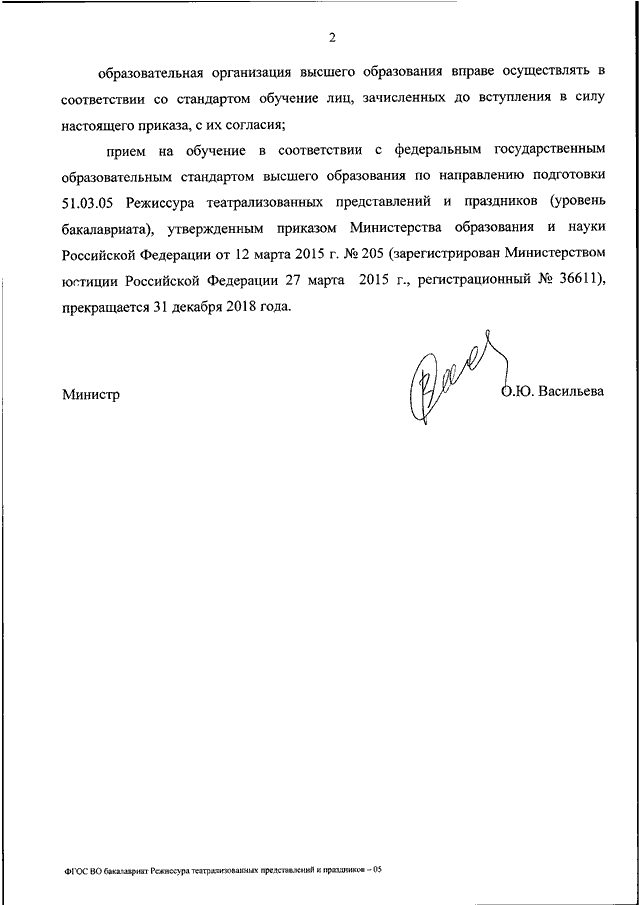 "ОБ УТВЕРЖДЕНИИ ФЕДЕРАЛЬНОГО ГОСУДАРСТВЕННОГО ОБРАЗОВАТЕЛЬНОГО СТАНДАРТА ВЫСШЕГО ОБРАЗОВАНИЯ - БАКАЛАВРИАТ ПО НАПРАВЛЕНИЮ ПОДГОТОВКИ 51.03.05 РЕЖИССУРА ТЕАТРАЛИЗОВАННЫХ ПРЕДСТАВЛЕНИЙ И ПРАЗДНИКОВ"