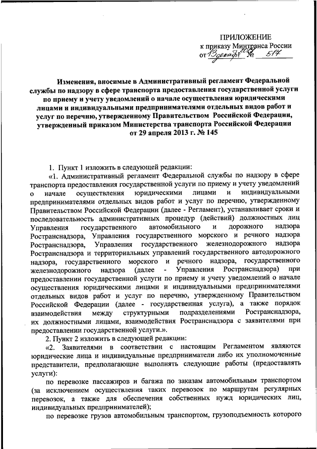 "О ВНЕСЕНИИ ИЗМЕНЕНИЙ В АДМИНИСТРАТИВНЫЙ РЕГЛАМЕНТ ФЕДЕРАЛЬНОЙ СЛУЖБЫ ПО НАДЗОРУ В СФЕРЕ ТРАНСПОРТА ПРЕДОСТАВЛЕНИЯ ГОСУДАРСТВЕННОЙ УСЛУГИ ПО ПРИЕМУ И УЧЕТУ УВЕДОМЛЕНИЙ О НАЧАЛЕ ОСУЩЕСТВЛЕНИЯ ЮРИДИЧЕСКИМИ ЛИЦАМИ И ИНДИВИДУАЛЬНЫМИ ПРЕДПРИНИМАТЕЛЯМИ ОТДЕЛЬНЫХ ВИДОВ РАБОТ И УСЛУГ ПО ПЕРЕЧНЮ, УТВЕРЖДЕННОМУ ПРАВИТЕЛЬСТВОМ РОССИЙСКОЙ ФЕДЕРАЦИИ, УТВЕРЖДЕННЫЙ ПРИКАЗОМ МИНИСТЕРСТВА ТРАНСПОРТА РОССИЙСКОЙ ФЕДЕРАЦИИ ОТ 29 АПРЕЛЯ 2013 Г. N 145"