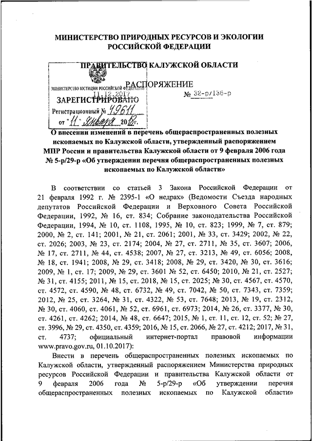ИСКОПАЕМЫХ ПО КАЛУЖСКОЙ ОБЛАСТИ, УТВЕРЖДЕННЫЙ РАСПОРЯЖЕНИЕМ МПР