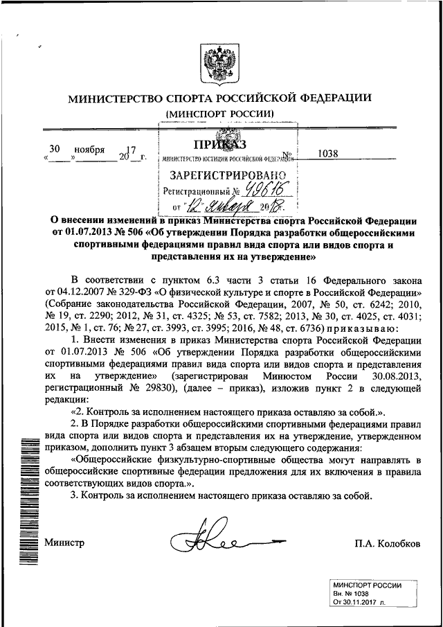 ПРИКАЗ Минспорта РФ от 30.11.2017 N 1038