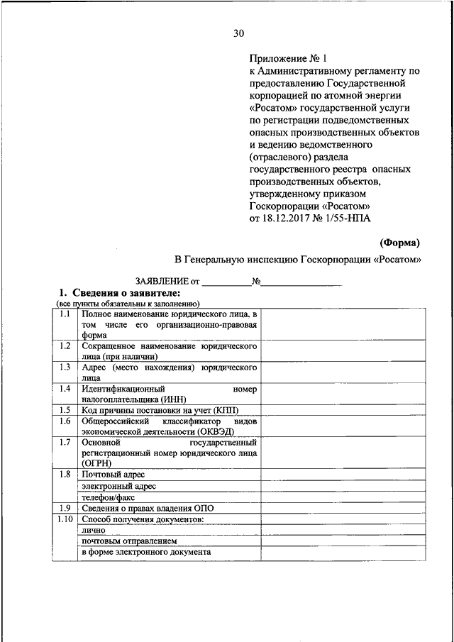 "Росатом" от 18.12.2017 N 1/55-НПА "ОБ УТВЕРЖДЕНИИ АДМИНИСТРАТИВНОГО РЕГЛАМЕНТА ПО ПРЕДОСТАВЛЕНИЮ ГОСУДАРСТВЕННОЙ КОРПОРАЦИЕЙ ПО АТОМНОЙ ЭНЕРГИИ "РОСАТОМ" ГОСУДАРСТВЕННОЙ УСЛУГИ ПО РЕГИСТРАЦИИ ПОДВЕДОМСТВЕННЫХ ОПАСНЫХ ПРОИЗВОДСТВЕННЫХ ОБЪЕКТОВ И ВЕДЕНИЮ ВЕДОМСТВЕННОГО (ОТРАСЛЕВОГО) РАЗДЕЛА ГОСУДАРСТВЕННОГО РЕЕСТРА ОПАСНЫХ ПРОИЗВОДСТВЕННЫХ ОБЪЕКТОВ"