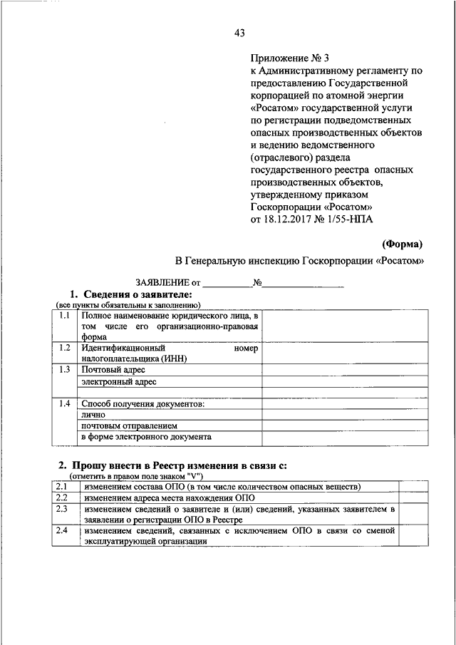 "Росатом" от 18.12.2017 N 1/55-НПА "ОБ УТВЕРЖДЕНИИ АДМИНИСТРАТИВНОГО РЕГЛАМЕНТА ПО ПРЕДОСТАВЛЕНИЮ ГОСУДАРСТВЕННОЙ КОРПОРАЦИЕЙ ПО АТОМНОЙ ЭНЕРГИИ "РОСАТОМ" ГОСУДАРСТВЕННОЙ УСЛУГИ ПО РЕГИСТРАЦИИ ПОДВЕДОМСТВЕННЫХ ОПАСНЫХ ПРОИЗВОДСТВЕННЫХ ОБЪЕКТОВ И ВЕДЕНИЮ ВЕДОМСТВЕННОГО (ОТРАСЛЕВОГО) РАЗДЕЛА ГОСУДАРСТВЕННОГО РЕЕСТРА ОПАСНЫХ ПРОИЗВОДСТВЕННЫХ ОБЪЕКТОВ"