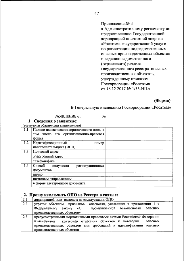 "Росатом" от 18.12.2017 N 1/55-НПА "ОБ УТВЕРЖДЕНИИ АДМИНИСТРАТИВНОГО РЕГЛАМЕНТА ПО ПРЕДОСТАВЛЕНИЮ ГОСУДАРСТВЕННОЙ КОРПОРАЦИЕЙ ПО АТОМНОЙ ЭНЕРГИИ "РОСАТОМ" ГОСУДАРСТВЕННОЙ УСЛУГИ ПО РЕГИСТРАЦИИ ПОДВЕДОМСТВЕННЫХ ОПАСНЫХ ПРОИЗВОДСТВЕННЫХ ОБЪЕКТОВ И ВЕДЕНИЮ ВЕДОМСТВЕННОГО (ОТРАСЛЕВОГО) РАЗДЕЛА ГОСУДАРСТВЕННОГО РЕЕСТРА ОПАСНЫХ ПРОИЗВОДСТВЕННЫХ ОБЪЕКТОВ"