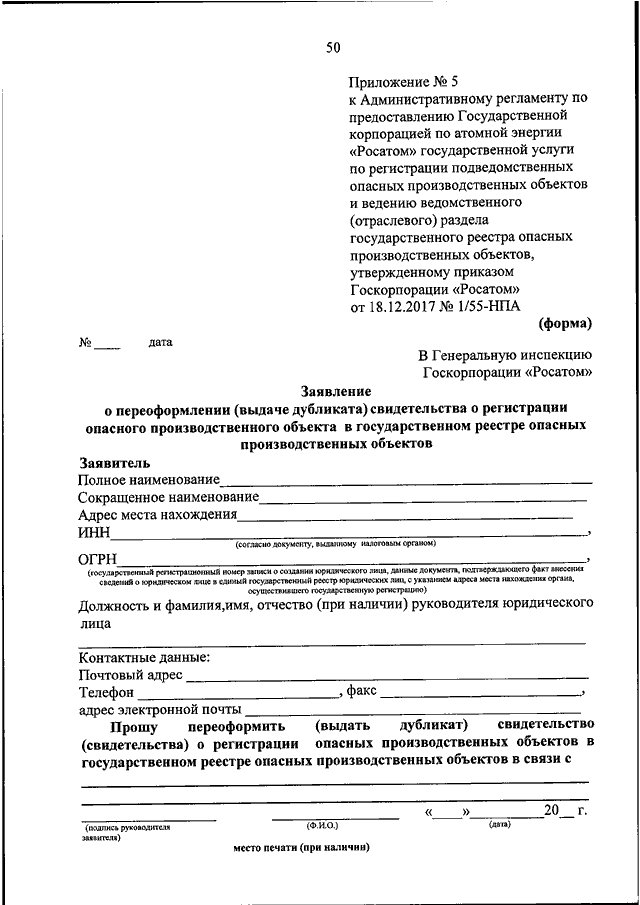 "Росатом" от 18.12.2017 N 1/55-НПА "ОБ УТВЕРЖДЕНИИ АДМИНИСТРАТИВНОГО РЕГЛАМЕНТА ПО ПРЕДОСТАВЛЕНИЮ ГОСУДАРСТВЕННОЙ КОРПОРАЦИЕЙ ПО АТОМНОЙ ЭНЕРГИИ "РОСАТОМ" ГОСУДАРСТВЕННОЙ УСЛУГИ ПО РЕГИСТРАЦИИ ПОДВЕДОМСТВЕННЫХ ОПАСНЫХ ПРОИЗВОДСТВЕННЫХ ОБЪЕКТОВ И ВЕДЕНИЮ ВЕДОМСТВЕННОГО (ОТРАСЛЕВОГО) РАЗДЕЛА ГОСУДАРСТВЕННОГО РЕЕСТРА ОПАСНЫХ ПРОИЗВОДСТВЕННЫХ ОБЪЕКТОВ"