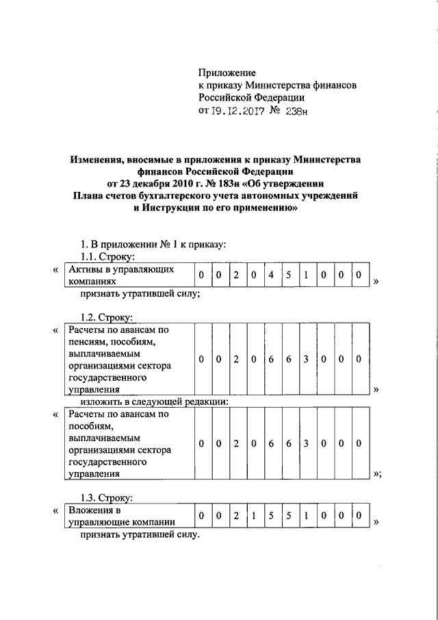 "О ВНЕСЕНИИ ИЗМЕНЕНИЙ В ПРИЛОЖЕНИЯ К ПРИКАЗУ МИНИСТЕРСТВА ФИНАНСОВ РОССИЙСКОЙ ФЕДЕРАЦИИ ОТ 23 ДЕКАБРЯ 2010 Г. N 183Н "ОБ УТВЕРЖДЕНИИ ПЛАНА СЧЕТОВ БУХГАЛТЕРСКОГО УЧЕТА АВТОНОМНЫХ УЧРЕЖДЕНИЙ И ИНСТРУКЦИИ ПО ЕГО ПРИМЕНЕНИЮ" И О ПРИЗНАНИИ УТРАТИВШИМИ СИЛУ ПОДПУНКТА "Г" ПУНКТА 3.7 И ПОДПУНКТА "В" ПУНКТА 3.29 ПРИЛОЖЕНИЯ К ПРИКАЗУ МИНИСТЕРСТВА ФИНАНСОВ РОССИЙСКОЙ ФЕДЕРАЦИИ ОТ 31 ДЕКАБРЯ 2015 Г. N 228Н"