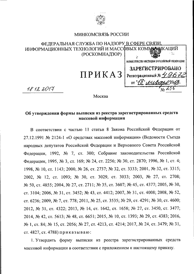 ПРИКАЗ Роскомнадзора от 18.12.2017 N 256