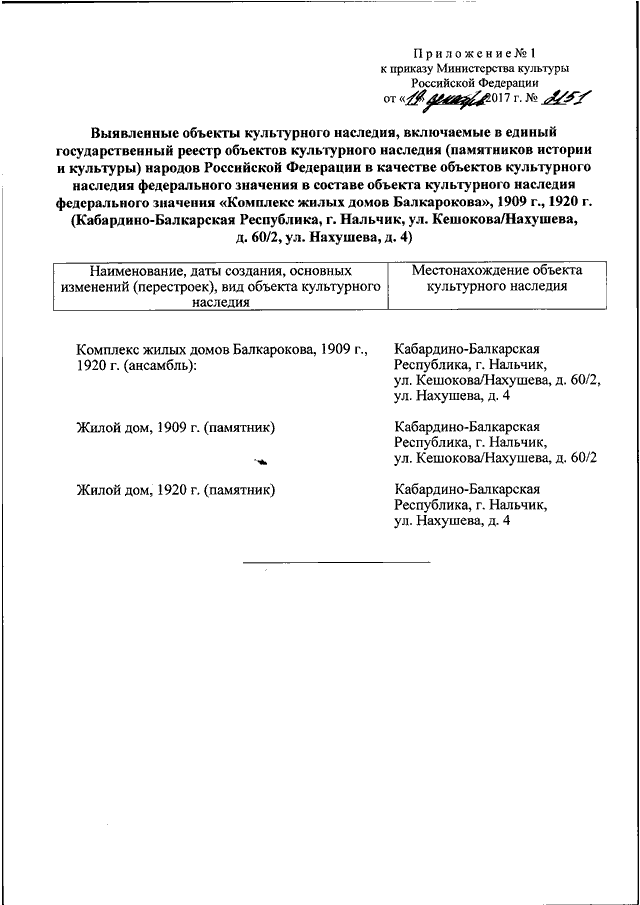 "О ВКЛЮЧЕНИИ ВЫЯВЛЕННОГО ОБЪЕКТА КУЛЬТУРНОГО НАСЛЕДИЯ "КОМПЛЕКС ЖИЛЫХ ДОМОВ БАЛКАРОКОВА", 1909 Г., 1920 Г. И ВЫЯВЛЕННЫХ ОБЪЕКТОВ КУЛЬТУРНОГО НАСЛЕДИЯ В ЕГО СОСТАВЕ (КАБАРДИНО - БАЛКАРСКАЯ РЕСПУБЛИКА) В ЕДИНЫЙ ГОСУДАРСТВЕННЫЙ РЕЕСТР ОБЪЕКТОВ КУЛЬТУРНОГО НАСЛЕДИЯ (ПАМЯТНИКОВ ИСТОРИИ И КУЛЬТУРЫ) НАРОДОВ РОССИЙСКОЙ ФЕДЕРАЦИИ В КАЧЕСТВЕ ОБЪЕКТОВ КУЛЬТУРНОГО НАСЛЕДИЯ ФЕДЕРАЛЬНОГО ЗНАЧЕНИЯ И УТВЕРЖДЕНИИ ГРАНИЦ ИХ ТЕРРИТОРИИ"