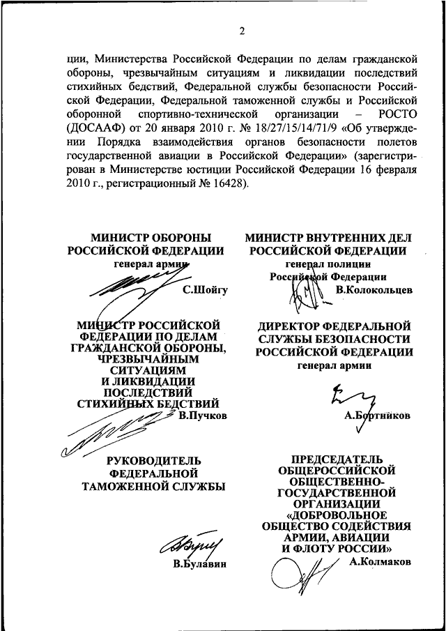 "Добровольное общество содействия Армии, Авиации и Флоту России" N 171 от 18.12.2017 "О ПРИЗНАНИИ УТРАТИВШИМ СИЛУ ПРИКАЗА МИНИСТРА ОБОРОНЫ РОССИЙСКОЙ ФЕДЕРАЦИИ, МИНИСТЕРСТВА ВНУТРЕННИХ ДЕЛ РОССИЙСКОЙ ФЕДЕРАЦИИ, МИНИСТЕРСТВА РОССИЙСКОЙ ФЕДЕРАЦИИ ПО ДЕЛАМ ГРАЖДАНСКОЙ ОБОРОНЫ, ЧРЕЗВЫЧАЙНЫМ СИТУАЦИЯМ И ЛИКВИДАЦИИ ПОСЛЕДСТВИЙ СТИХИЙНЫХ БЕДСТВИЙ, ФЕДЕРАЛЬНОЙ СЛУЖБЫ БЕЗОПАСНОСТИ РОССИЙСКОЙ ФЕДЕРАЦИИ, ФЕДЕРАЛЬНОЙ ТАМОЖЕННОЙ СЛУЖБЫ И РОССИЙСКОЙ ОБОРОННОЙ СПОРТИВНО - ТЕХНИЧЕСКОЙ ОРГАНИЗАЦИИ - РОСТО (ДОСААФ) ОТ 20 ЯНВАРЯ 2010 Г. N 18/27/15/14/71/9 "ОБ УТВЕРЖДЕНИИ ПОРЯДКА ВЗАИМОДЕЙСТВИЯ ОРГАНОВ БЕЗОПАСНОСТИ ПОЛЕТОВ ГОСУДАРСТВЕННОЙ АВИАЦИИ В РОССИЙСКОЙ ФЕДЕРАЦИИ"