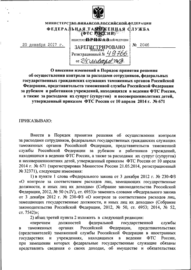 ПРИКАЗ ФТС РФ от 20.12.2017 N 2046