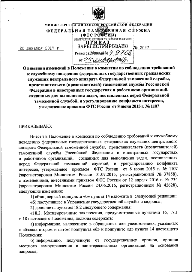 ПРИКАЗ ФТС РФ от 20.12.2017 N 2047