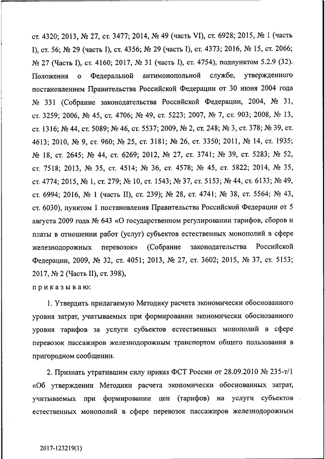 "ОБ УТВЕРЖДЕНИИ МЕТОДИКИ РАСЧЕТА ЭКОНОМИЧЕСКИ ОБОСНОВАННОГО УРОВНЯ ЗАТРАТ, УЧИТЫВАЕМЫХ ПРИ ФОРМИРОВАНИИ ЭКОНОМИЧЕСКИ ОБОСНОВАННОГО УРОВНЯ ТАРИФОВ ЗА УСЛУГИ СУБЪЕКТОВ ЕСТЕСТВЕННЫХ МОНОПОЛИЙ В СФЕРЕ ПЕРЕВОЗОК ПАССАЖИРОВ ЖЕЛЕЗНОДОРОЖНЫМ ТРАНСПОРТОМ ОБЩЕГО ПОЛЬЗОВАНИЯ В ПРИГОРОДНОМ СООБЩЕНИИ"