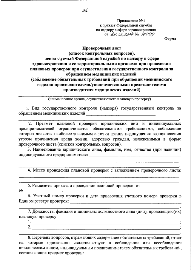 "ОБ УТВЕРЖДЕНИИ ФОРМ ПРОВЕРОЧНЫХ ЛИСТОВ (СПИСКОВ КОНТРОЛЬНЫХ ВОПРОСОВ), ИСПОЛЬЗУЕМЫХ ФЕДЕРАЛЬНОЙ СЛУЖБОЙ ПО НАДЗОРУ В СФЕРЕ ЗДРАВООХРАНЕНИЯ И ЕЕ ТЕРРИТОРИАЛЬНЫМИ ОРГАНАМИ ПРИ ПРОВЕДЕНИИ ПЛАНОВЫХ ПРОВЕРОК ПРИ ОСУЩЕСТВЛЕНИИ ГОСУДАРСТВЕННОГО КОНТРОЛЯ ЗА ОБРАЩЕНИЕМ МЕДИЦИНСКИХ ИЗДЕЛИЙ"
