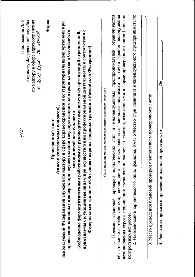 "ОБ УТВЕРЖДЕНИИ ФОРМ ПРОВЕРОЧНЫХ ЛИСТОВ (СПИСКОВ КОНТРОЛЬНЫХ ВОПРОСОВ), ИСПОЛЬЗУЕМЫХ ФЕДЕРАЛЬНОЙ СЛУЖБОЙ ПО НАДЗОРУ В СФЕРЕ ЗДРАВООХРАНЕНИЯ И ЕЕ ТЕРРИТОРИАЛЬНЫМИ ОРГАНАМИ ПРИ ПРОВЕДЕНИИ ПЛАНОВЫХ ПРОВЕРОК ПРИ ОСУЩЕСТВЛЕНИИ ГОСУДАРСТВЕННОГО КОНТРОЛЯ КАЧЕСТВА И БЕЗОПАСНОСТИ МЕДИЦИНСКОЙ ДЕЯТЕЛЬНОСТИ"