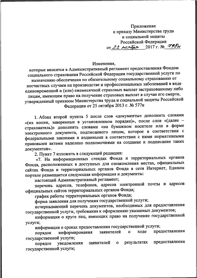 "О ВНЕСЕНИИ ИЗМЕНЕНИЙ В АДМИНИСТРАТИВНЫЙ РЕГЛАМЕНТ ПРЕДОСТАВЛЕНИЯ ФОНДОМ СОЦИАЛЬНОГО СТРАХОВАНИЯ РОССИЙСКОЙ ФЕДЕРАЦИИ ГОСУДАРСТВЕННОЙ УСЛУГИ ПО НАЗНАЧЕНИЮ ОБЕСПЕЧЕНИЯ ПО ОБЯЗАТЕЛЬНОМУ СОЦИАЛЬНОМУ СТРАХОВАНИЮ ОТ НЕСЧАСТНЫХ СЛУЧАЕВ НА ПРОИЗВОДСТВЕ И ПРОФЕССИОНАЛЬНЫХ ЗАБОЛЕВАНИЙ В ВИДЕ ЕДИНОВРЕМЕННОЙ И (ИЛИ) ЕЖЕМЕСЯЧНОЙ СТРАХОВЫХ ВЫПЛАТ ЗАСТРАХОВАННОМУ ЛИБО ЛИЦАМ, ИМЕЮЩИМ ПРАВО НА ПОЛУЧЕНИЕ СТРАХОВЫХ ВЫПЛАТ В СЛУЧАЕ ЕГО СМЕРТИ, УТВЕРЖДЕННЫЙ ПРИКАЗОМ МИНИСТЕРСТВА ТРУДА И СОЦИАЛЬНОЙ ЗАЩИТЫ РОССИЙСКОЙ ФЕДЕРАЦИИ ОТ 25 ОКТЯБРЯ 2013 Г. N 577Н"