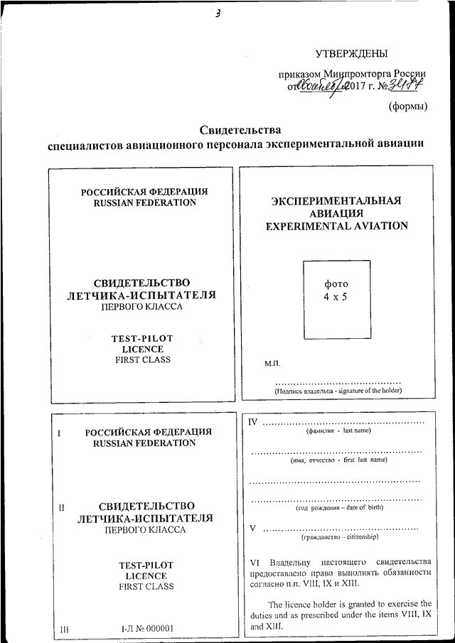 "ОБ УТВЕРЖДЕНИИ ФОРМ СВИДЕТЕЛЬСТВ СПЕЦИАЛИСТОВ АВИАЦИОННОГО ПЕРСОНАЛА ЭКСПЕРИМЕНТАЛЬНОЙ АВИАЦИИ И ПРАВИЛ ИХ ЗАПОЛНЕНИЯ"