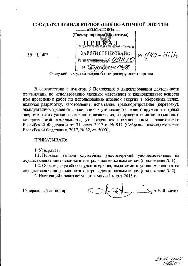 "Росатом" от 29.11.2017 N 1/49-НПА "О СЛУЖЕБНЫХ УДОСТОВЕРЕНИЯХ ЛИЦЕНЗИРУЮЩЕГО ОРГАНА"