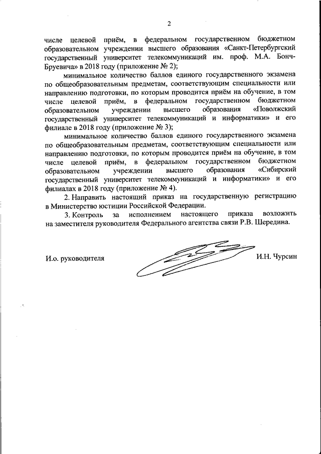 "ОБ УСТАНОВЛЕНИИ МИНИМАЛЬНОГО КОЛИЧЕСТВА БАЛЛОВ ЕДИНОГО ГОСУДАРСТВЕННОГО ЭКЗАМЕНА ПО ОБЩЕОБРАЗОВАТЕЛЬНЫМ ПРЕДМЕТАМ, СООТВЕТСТВУЮЩИМ СПЕЦИАЛЬНОСТИ ИЛИ НАПРАВЛЕНИЯМ ПОДГОТОВКИ, ПО КОТОРЫМ ПРОВОДИТСЯ ПРИЕМ НА ОБУЧЕНИЕ, В ТОМ ЧИСЛЕ ЦЕЛЕВОЙ ПРИЕМ, В ОБРАЗОВАТЕЛЬНЫХ ОРГАНИЗАЦИЯХ, НАХОДЯЩИХСЯ В ВЕДЕНИИ ФЕДЕРАЛЬНОГО АГЕНТСТВА СВЯЗИ, В 2018 ГОДУ"