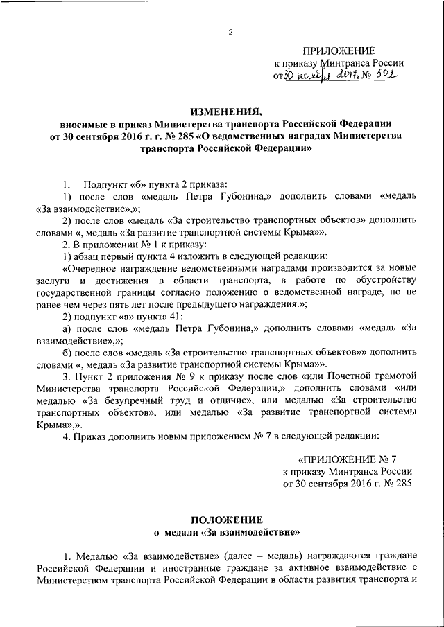 "О ВНЕСЕНИИ ИЗМЕНЕНИЙ В ПРИКАЗ МИНИСТЕРСТВА ТРАНСПОРТА РОССИЙСКОЙ ФЕДЕРАЦИИ ОТ 30 СЕНТЯБРЯ 2016 Г. N 285 "О ВЕДОМСТВЕННЫХ НАГРАДАХ МИНИСТЕРСТВА ТРАНСПОРТА РОССИЙСКОЙ ФЕДЕРАЦИИ"