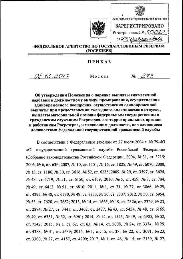 ПРИКАЗ Росрезерва от 08.12.2017 N 273