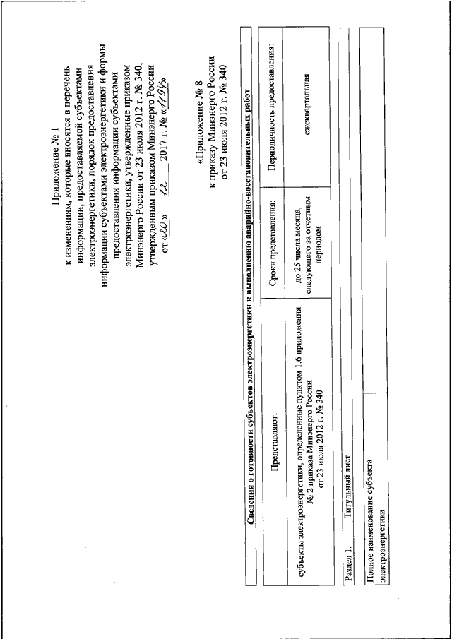 "О ВНЕСЕНИИ ИЗМЕНЕНИЙ В ПЕРЕЧЕНЬ ИНФОРМАЦИИ, ПРЕДОСТАВЛЯЕМОЙ СУБЪЕКТАМИ ЭЛЕКТРОЭНЕРГЕТИКИ, ПОРЯДОК ПРЕДОСТАВЛЕНИЯ ИНФОРМАЦИИ СУБЪЕКТАМИ ЭЛЕКТРОЭНЕРГЕТИКИ И ФОРМЫ ПРЕДОСТАВЛЕНИЯ ИНФОРМАЦИИ СУБЪЕКТАМИ ЭЛЕКТРОЭНЕРГЕТИКИ, УТВЕРЖДЕННЫЕ ПРИКАЗОМ МИНЭНЕРГО РОССИИ ОТ 23 ИЮЛЯ 2012 Г. N 340"