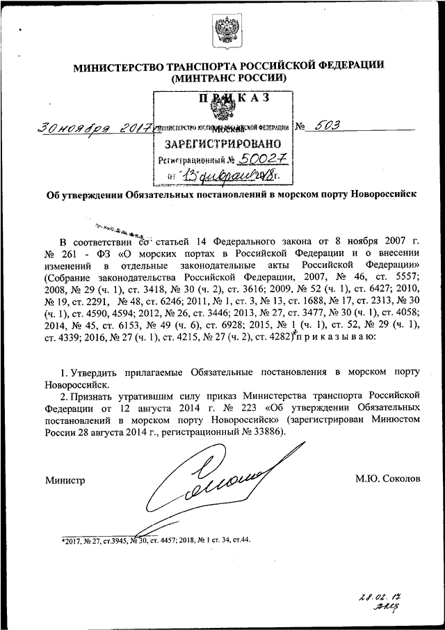ПРИКАЗ Минтранса РФ от 30.11.2017 N 503