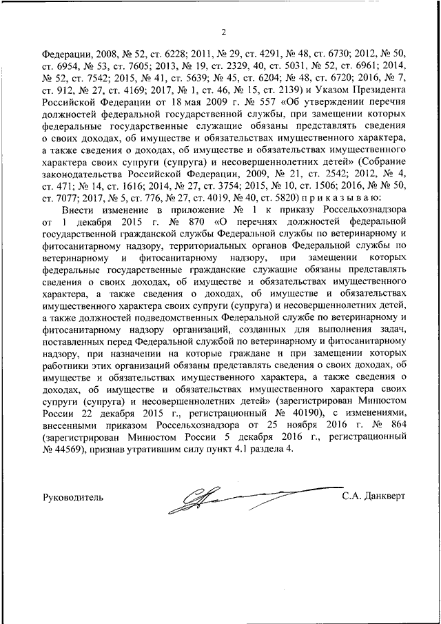"О ВНЕСЕНИИ ИЗМЕНЕНИЯ В ПРИЛОЖЕНИЕ N 1 К ПРИКАЗУ РОССЕЛЬХОЗНАДЗОРА ОТ 1 ДЕКАБРЯ 2015 Г. N 870 "О ПЕРЕЧНЯХ ДОЛЖНОСТЕЙ ФЕДЕРАЛЬНОЙ ГОСУДАРСТВЕННОЙ ГРАЖДАНСКОЙ СЛУЖБЫ ФЕДЕРАЛЬНОЙ СЛУЖБЫ ПО ВЕТЕРИНАРНОМУ И ФИТОСАНИТАРНОМУ НАДЗОРУ, ТЕРРИТОРИАЛЬНЫХ ОРГАНОВ ФЕДЕРАЛЬНОЙ СЛУЖБЫ ПО ВЕТЕРИНАРНОМУ И ФИТОСАНИТАРНОМУ НАДЗОРУ, ПРИ ЗАМЕЩЕНИИ КОТОРЫХ ФЕДЕРАЛЬНЫЕ ГОСУДАРСТВЕННЫЕ ГРАЖДАНСКИЕ СЛУЖАЩИЕ ОБЯЗАНЫ ПРЕДСТАВЛЯТЬ СВЕДЕНИЯ О СВОИХ ДОХОДАХ, ОБ ИМУЩЕСТВЕ И ОБЯЗАТЕЛЬСТВАХ ИМУЩЕСТВЕННОГО ХАРАКТЕРА, А ТАКЖЕ СВЕДЕНИЯ О ДОХОДАХ, ОБ ИМУЩЕСТВЕ И ОБЯЗАТЕЛЬСТВАХ ИМУЩЕСТВЕННОГО ХАРАКТЕРА СВОИХ СУПРУГИ (СУПРУГА) И НЕСОВЕРШЕННОЛЕТНИХ ДЕТЕЙ, А ТАКЖЕ ДОЛЖНОСТЕЙ ПОДВЕДОМСТВЕННЫХ ФЕДЕРАЛЬНОЙ СЛУЖБЕ ПО ВЕТЕРИНАРНОМУ И ФИТОСАНИТАРНОМУ НАДЗОРУ ОРГАНИЗАЦИЙ, СОЗДАННЫХ ДЛЯ ВЫПОЛНЕНИЯ ЗАДАЧ, ПОСТАВЛЕННЫХ ПЕРЕД ФЕДЕРАЛЬНОЙ СЛУЖБОЙ ПО ВЕТЕРИНАРНОМУ И ФИТОСАНИТАРНОМУ НАДЗОРУ, ПРИ НАЗНАЧЕНИИ НА КОТОРЫЕ ГРАЖДАНЕ И ПРИ ЗАМЕЩЕНИИ КОТОРЫХ РАБОТНИКИ ЭТИХ ОРГАНИЗАЦИЙ ОБЯЗАНЫ ПРЕДСТАВЛЯТЬ СВЕДЕНИЯ О СВОИХ ДОХОДАХ, ОБ ИМУЩЕСТВЕ И ОБЯЗАТЕЛЬСТВАХ ИМУЩЕСТВЕННОГО ХАРАКТЕРА, А ТАКЖЕ СВЕДЕНИЯ О ДОХОДАХ, ОБ ИМУЩЕСТВЕ И ОБЯЗАТЕЛЬСТВАХ ИМУЩЕСТВЕННОГО ХАРАКТЕРА СВОИХ СУПРУГИ (СУПРУГА) И НЕСОВЕРШЕННОЛЕТНИХ ДЕТЕЙ"