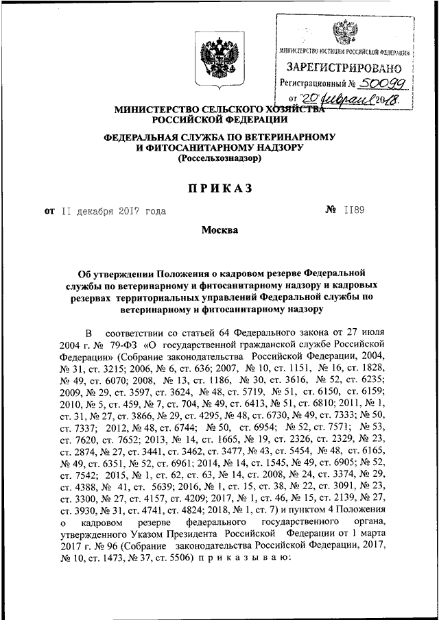 ПРИКАЗ Россельхознадзора от 11.12.2017 N 1189