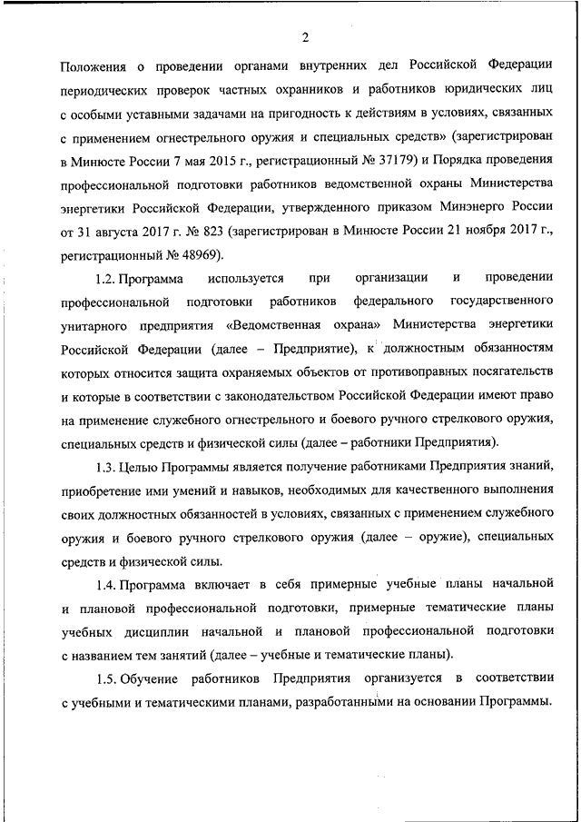 "ОБ УТВЕРЖДЕНИИ ПРОГРАММЫ ПОДГОТОВКИ РАБОТНИКОВ ВЕДОМСТВЕННОЙ ОХРАНЫ МИНИСТЕРСТВА ЭНЕРГЕТИКИ РОССИЙСКОЙ ФЕДЕРАЦИИ К ДЕЙСТВИЯМ В УСЛОВИЯХ, СВЯЗАННЫХ С ПРИМЕНЕНИЕМ СЛУЖЕБНОГО ОГНЕСТРЕЛЬНОГО И БОЕВОГО ОРУЖИЯ, СПЕЦИАЛЬНЫХ СРЕДСТВ И ФИЗИЧЕСКОЙ СИЛЫ"