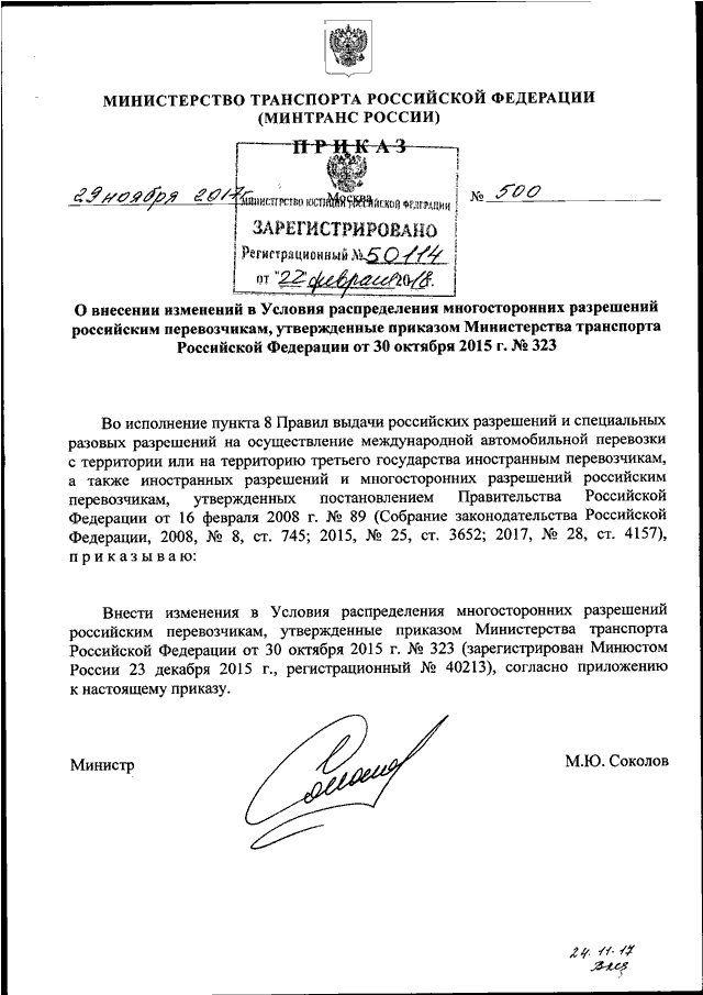 ПРИКАЗ Минтранса РФ от 29.11.2017 N 500