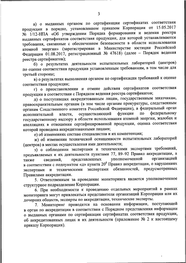 "Росатом" от 04.12.2017 N 1/50-НПА "ОБ УТВЕРЖДЕНИИ ПОРЯДКА ОСУЩЕСТВЛЕНИЯ МОНИТОРИНГА ДЕЯТЕЛЬНОСТИ АККРЕДИТОВАННЫХ ЛИЦ, ЭКСПЕРТОВ ПО АККРЕДИТАЦИИ И ТЕХНИЧЕСКИХ ЭКСПЕРТОВ И ПОРЯДКА ПРЕДСТАВЛЕНИЯ ИНФОРМАЦИИ О ВЫДАННЫХ ОРГАНАМИ ПО СЕРТИФИКАЦИИ СЕРТИФИКАТАХ СООТВЕТСТВИЯ ПРОДУКЦИИ, ОБ АККРЕДИТОВАННЫХ ЛИЦАХ И ИХ ДЕЯТЕЛЬНОСТИ"