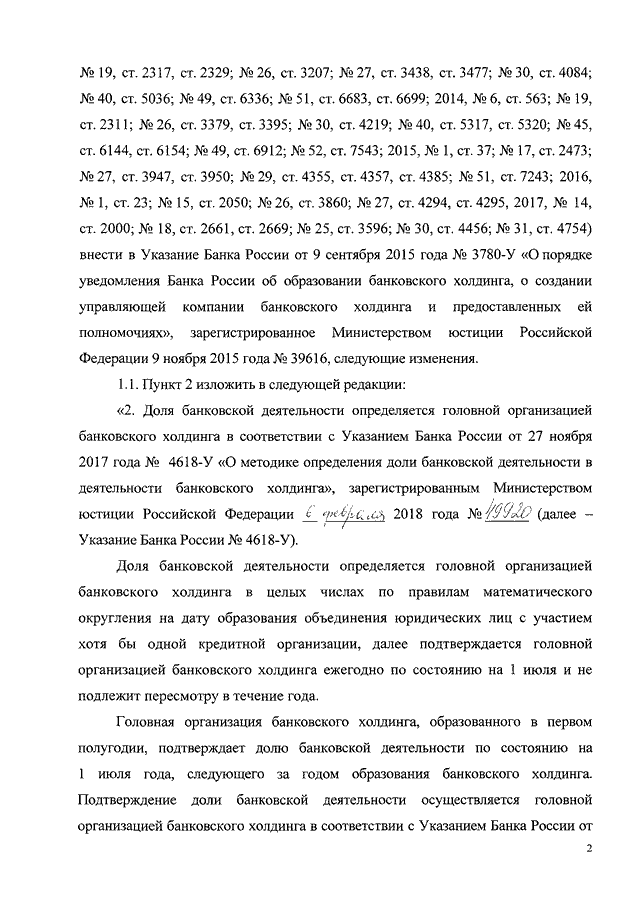 "О ВНЕСЕНИИ ИЗМЕНЕНИЙ В УКАЗАНИЕ БАНКА РОССИИ ОТ 9 СЕНТЯБРЯ 2015 Г. N 3780-У "О ПОРЯДКЕ УВЕДОМЛЕНИЯ БАНКА РОССИИ ОБ ОБРАЗОВАНИИ БАНКОВСКОГО ХОЛДИНГА, О СОЗДАНИИ УПРАВЛЯЮЩЕЙ КОМПАНИИ БАНКОВСКОГО ХОЛДИНГА И ПРЕДОСТАВЛЕННЫХ ЕЙ ПОЛНОМОЧИЯХ"