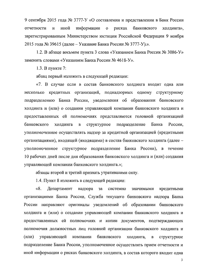 "О ВНЕСЕНИИ ИЗМЕНЕНИЙ В УКАЗАНИЕ БАНКА РОССИИ ОТ 9 СЕНТЯБРЯ 2015 Г. N 3780-У "О ПОРЯДКЕ УВЕДОМЛЕНИЯ БАНКА РОССИИ ОБ ОБРАЗОВАНИИ БАНКОВСКОГО ХОЛДИНГА, О СОЗДАНИИ УПРАВЛЯЮЩЕЙ КОМПАНИИ БАНКОВСКОГО ХОЛДИНГА И ПРЕДОСТАВЛЕННЫХ ЕЙ ПОЛНОМОЧИЯХ"