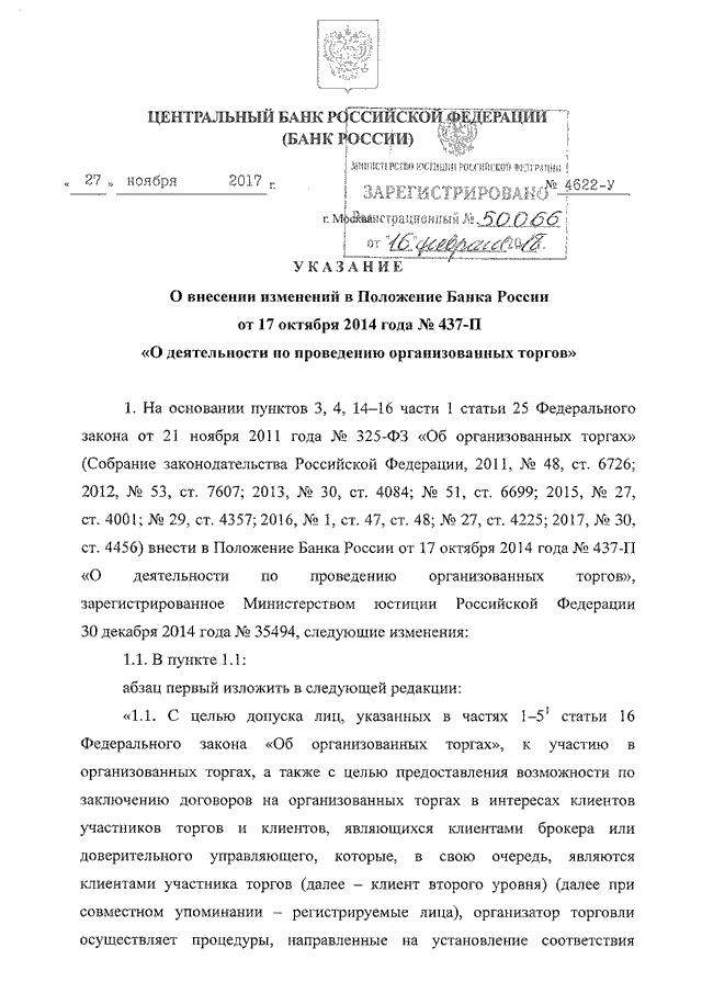 "О ВНЕСЕНИИ ИЗМЕНЕНИЙ В ПОЛОЖЕНИЕ БАНКА РОССИИ ОТ 17 ОКТЯБРЯ 2014 Г. N 437-П "О ДЕЯТЕЛЬНОСТИ ПО ПРОВЕДЕНИЮ ОРГАНИЗОВАННЫХ ТОРГОВ"