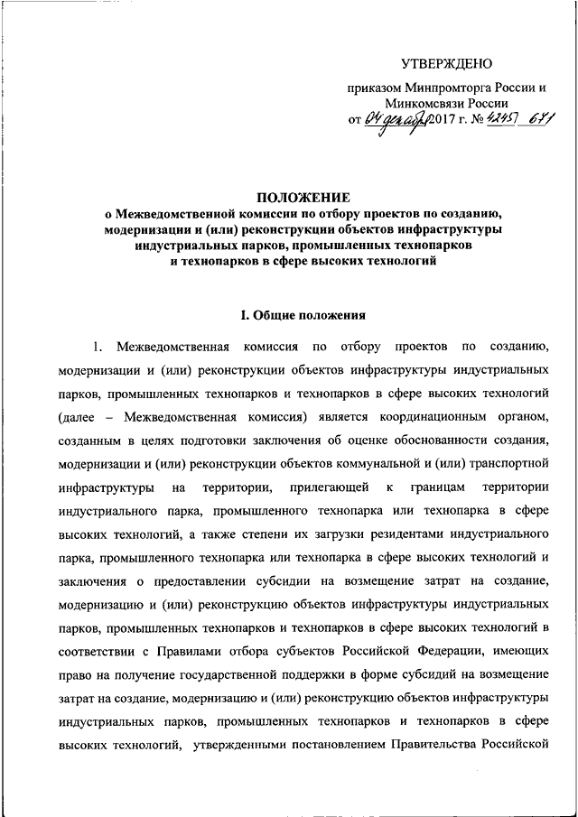 "О МЕЖВЕДОМСТВЕННОЙ КОМИССИИ ПО ОТБОРУ ПРОЕКТОВ ПО СОЗДАНИЮ, МОДЕРНИЗАЦИИ И (ИЛИ) РЕКОНСТРУКЦИИ ОБЪЕКТОВ ИНФРАСТРУКТУРЫ ИНДУСТРИАЛЬНЫХ ПАРКОВ, ПРОМЫШЛЕННЫХ ТЕХНОПАРКОВ И ТЕХНОПАРКОВ В СФЕРЕ ВЫСОКИХ ТЕХНОЛОГИЙ"