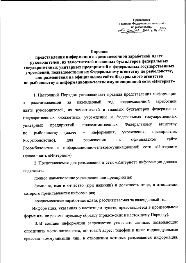 "ОБ УТВЕРЖДЕНИИ ПОРЯДКА ПРЕДСТАВЛЕНИЯ ИНФОРМАЦИИ О СРЕДНЕМЕСЯЧНОЙ ЗАРАБОТНОЙ ПЛАТЕ РУКОВОДИТЕЛЕЙ, ИХ ЗАМЕСТИТЕЛЕЙ И ГЛАВНЫХ БУХГАЛТЕРОВ ФЕДЕРАЛЬНЫХ ГОСУДАРСТВЕННЫХ УНИТАРНЫХ ПРЕДПРИЯТИЙ И ФЕДЕРАЛЬНЫХ ГОСУДАРСТВЕННЫХ УЧРЕЖДЕНИЙ, ПОДВЕДОМСТВЕННЫХ ФЕДЕРАЛЬНОМУ АГЕНТСТВУ ПО РЫБОЛОВСТВУ, ДЛЯ РАЗМЕЩЕНИЯ НА ОФИЦИАЛЬНОМ САЙТЕ ФЕДЕРАЛЬНОГО АГЕНТСТВА ПО РЫБОЛОВСТВУ В ИНФОРМАЦИОННО - ТЕЛЕКОММУНИКАЦИОННОЙ СЕТИ "ИНТЕРНЕТ"
