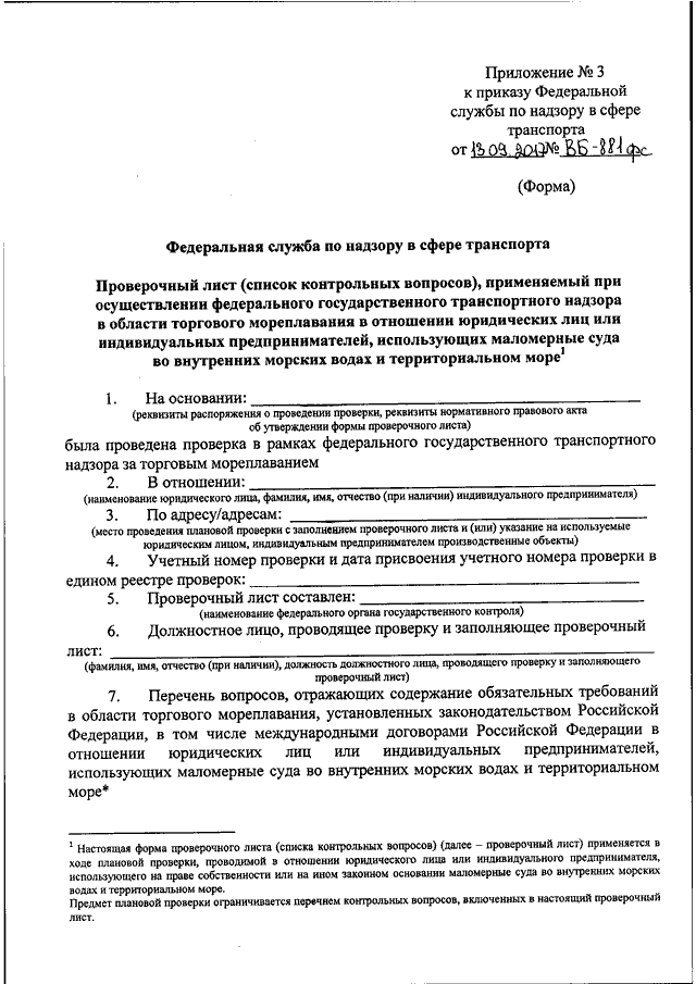 "ОБ УТВЕРЖДЕНИИ ФОРМ ПРОВЕРОЧНЫХ ЛИСТОВ (СПИСКОВ КОНТРОЛЬНЫХ ВОПРОСОВ), ПРИМЕНЯЕМЫХ ПРИ ОСУЩЕСТВЛЕНИИ ФЕДЕРАЛЬНОГО ГОСУДАРСТВЕННОГО ТРАНСПОРТНОГО НАДЗОРА В ОБЛАСТИ ТОРГОВОГО МОРЕПЛАВАНИЯ И ВНУТРЕННЕГО ВОДНОГО ТРАНСПОРТА"