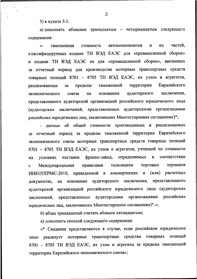 "О ВНЕСЕНИИ ИЗМЕНЕНИЙ В ПОРЯДОК, ОПРЕДЕЛЯЮЩИЙ ПОНЯТИЕ "ПРОМЫШЛЕННАЯ СБОРКА" МОТОРНЫХ ТРАНСПОРТНЫХ СРЕДСТВ И УСТАНАВЛИВАЮЩИЙ ПРИМЕНЕНИЕ ДАННОГО ПОНЯТИЯ ПРИ ВВОЗЕ НА ТЕРРИТОРИЮ РОССИЙСКОЙ ФЕДЕРАЦИИ АВТОКОМПОНЕНТОВ ДЛЯ ПРОИЗВОДСТВА МОТОРНЫХ ТРАНСПОРТНЫХ СРЕДСТВ ТОВАРНЫХ ПОЗИЦИЙ 8701 - 8705 ТН ВЭД ЕАЭС, ИХ УЗЛОВ И АГРЕГАТОВ"