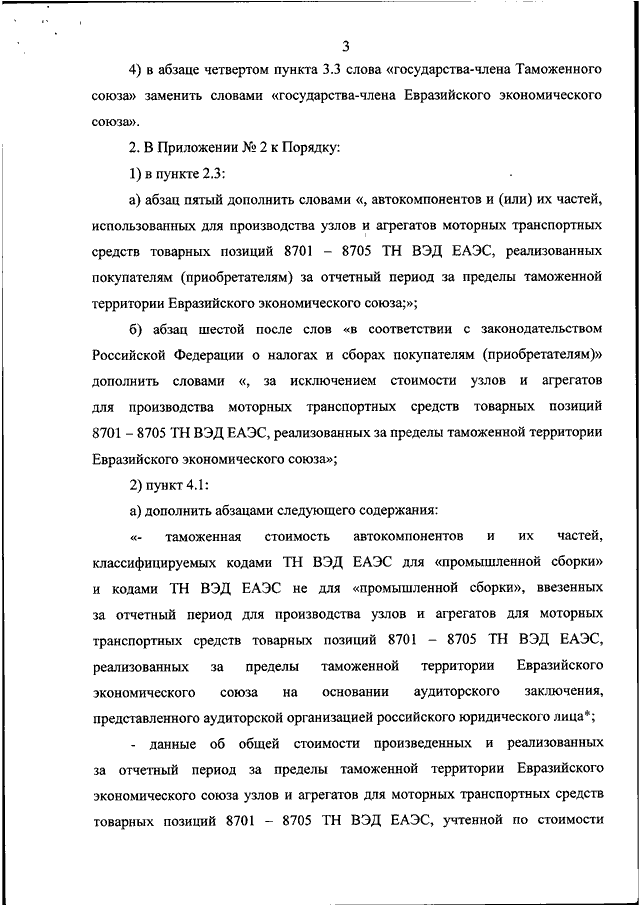"О ВНЕСЕНИИ ИЗМЕНЕНИЙ В ПОРЯДОК, ОПРЕДЕЛЯЮЩИЙ ПОНЯТИЕ "ПРОМЫШЛЕННАЯ СБОРКА" МОТОРНЫХ ТРАНСПОРТНЫХ СРЕДСТВ И УСТАНАВЛИВАЮЩИЙ ПРИМЕНЕНИЕ ДАННОГО ПОНЯТИЯ ПРИ ВВОЗЕ НА ТЕРРИТОРИЮ РОССИЙСКОЙ ФЕДЕРАЦИИ АВТОКОМПОНЕНТОВ ДЛЯ ПРОИЗВОДСТВА МОТОРНЫХ ТРАНСПОРТНЫХ СРЕДСТВ ТОВАРНЫХ ПОЗИЦИЙ 8701 - 8705 ТН ВЭД ЕАЭС, ИХ УЗЛОВ И АГРЕГАТОВ"