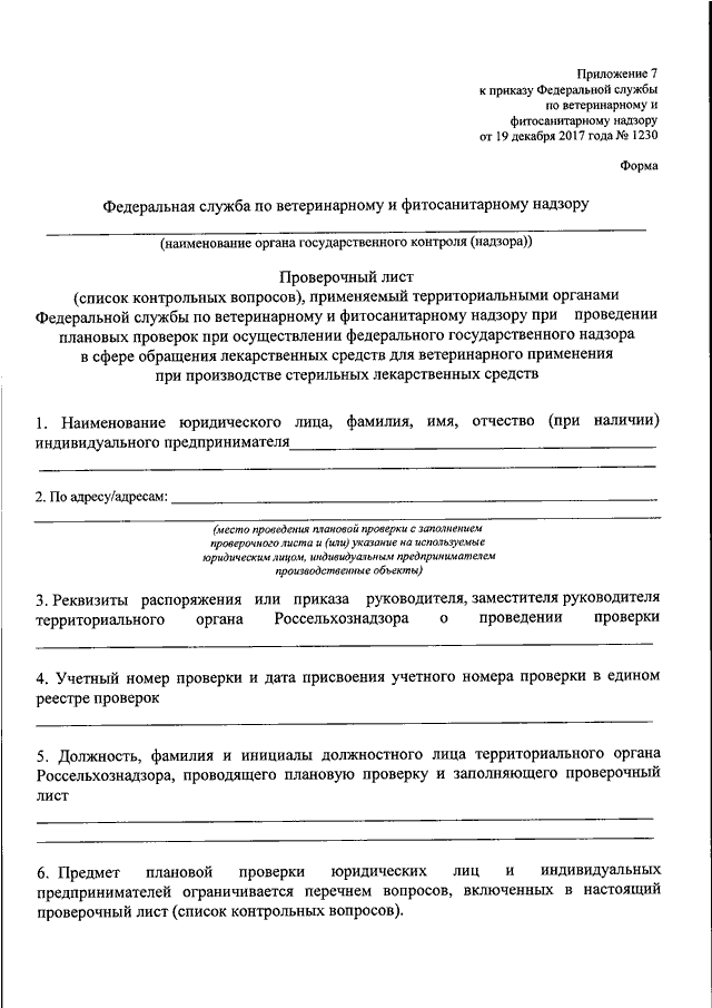 "ОБ УТВЕРЖДЕНИИ ФОРМ ПРОВЕРОЧНЫХ ЛИСТОВ (СПИСКОВ КОНТРОЛЬНЫХ ВОПРОСОВ), ИСПОЛЬЗУЕМЫХ ДОЛЖНОСТНЫМИ ЛИЦАМИ ТЕРРИТОРИАЛЬНЫХ ОРГАНОВ ФЕДЕРАЛЬНОЙ СЛУЖБЫ ПО ВЕТЕРИНАРНОМУ И ФИТОСАНИТАРНОМУ НАДЗОРУ ПРИ ПРОВЕДЕНИИ ПЛАНОВЫХ ПРОВЕРОК В РАМКАХ ОСУЩЕСТВЛЕНИЯ ФЕДЕРАЛЬНОГО ГОСУДАРСТВЕННОГО НАДЗОРА В СФЕРЕ ОБРАЩЕНИЯ ЛЕКАРСТВЕННЫХ СРЕДСТВ ДЛЯ ВЕТЕРИНАРНОГО ПРИМЕНЕНИЯ"