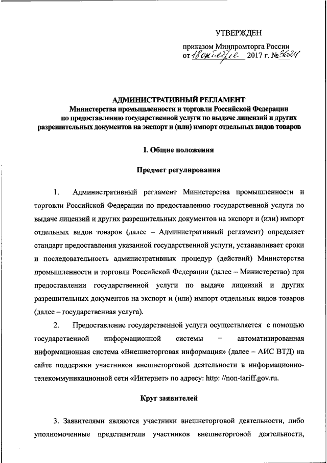 "ОБ УТВЕРЖДЕНИИ АДМИНИСТРАТИВНОГО РЕГЛАМЕНТА МИНИСТЕРСТВА ПРОМЫШЛЕННОСТИ И ТОРГОВЛИ РОССИЙСКОЙ ФЕДЕРАЦИИ ПО ПРЕДОСТАВЛЕНИЮ ГОСУДАРСТВЕННОЙ УСЛУГИ ПО ВЫДАЧЕ ЛИЦЕНЗИЙ И ДРУГИХ РАЗРЕШИТЕЛЬНЫХ ДОКУМЕНТОВ НА ЭКСПОРТ И (ИЛИ) ИМПОРТ ОТДЕЛЬНЫХ ВИДОВ ТОВАРОВ"