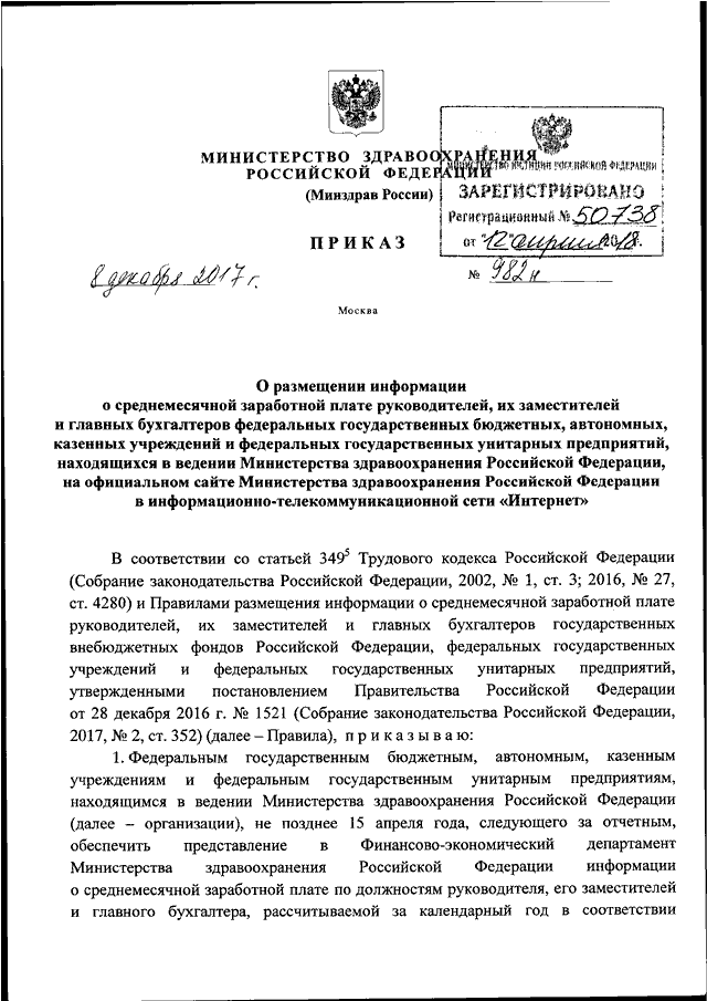 ПРИКАЗ Минздрава РФ от 08.12.2017 N 982н