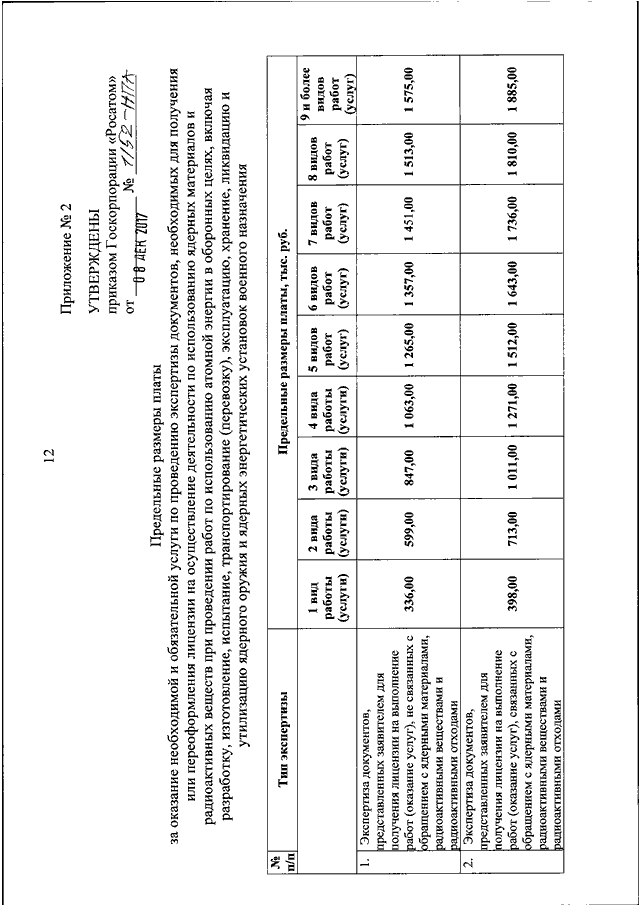 "Росатом" от 08.12.2017 N 1/52-НПА "ОБ УТВЕРЖДЕНИИ МЕТОДИКИ ОПРЕДЕЛЕНИЯ РАЗМЕРА ПЛАТЫ ЗА ОКАЗАНИЕ НЕОБХОДИМОЙ И ОБЯЗАТЕЛЬНОЙ УСЛУГИ ПО ПРОВЕДЕНИЮ ЭКСПЕРТИЗЫ ДОКУМЕНТОВ, НЕОБХОДИМЫХ ДЛЯ ПОЛУЧЕНИЯ ИЛИ ПЕРЕОФОРМЛЕНИЯ ЛИЦЕНЗИИ НА ОСУЩЕСТВЛЕНИЕ ДЕЯТЕЛЬНОСТИ ПО ИСПОЛЬЗОВАНИЮ ЯДЕРНЫХ МАТЕРИАЛОВ И РАДИОАКТИВНЫХ ВЕЩЕСТВ ПРИ ПРОВЕДЕНИИ РАБОТ ПО ИСПОЛЬЗОВАНИЮ АТОМНОЙ ЭНЕРГИИ В ОБОРОННЫХ ЦЕЛЯХ, ВКЛЮЧАЯ РАЗРАБОТКУ, ИЗГОТОВЛЕНИЕ, ИСПЫТАНИЕ, ТРАНСПОРТИРОВАНИЕ (ПЕРЕВОЗКУ), ЭКСПЛУАТАЦИЮ, ХРАНЕНИЕ, ЛИКВИДАЦИЮ И УТИЛИЗАЦИЮ ЯДЕРНОГО ОРУЖИЯ И ЯДЕРНЫХ ЭНЕРГЕТИЧЕСКИХ УСТАНОВОК ВОЕННОГО НАЗНАЧЕНИЯ, И ПРЕДЕЛЬНЫХ РАЗМЕРОВ ПЛАТЫ ЗА ОКАЗАНИЕ УКАЗАННОЙ УСЛУГИ"