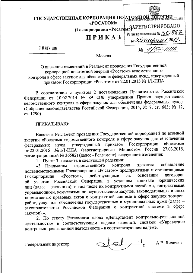 ПРИКАЗОМ ГОСКОРПОРАЦИИ "РОСАТОМ" ОТ 22.01.2015 N 1/1-НПА"