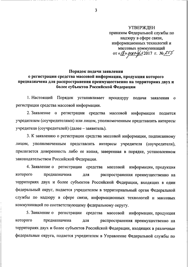 "ОБ УТВЕРЖДЕНИИ ПОРЯДКА ПОДАЧИ ЗАЯВЛЕНИЯ О РЕГИСТРАЦИИ СРЕДСТВА МАССОВОЙ ИНФОРМАЦИИ, ПРОДУКЦИЯ КОТОРОГО ПРЕДНАЗНАЧЕНА ДЛЯ РАСПРОСТРАНЕНИЯ ПРЕИМУЩЕСТВЕННО НА ТЕРРИТОРИЯХ ДВУХ И БОЛЕЕ СУБЪЕКТОВ РОССИЙСКОЙ ФЕДЕРАЦИИ"