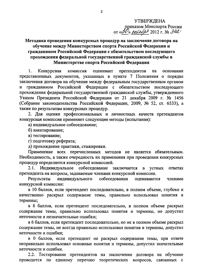 "ОБ УТВЕРЖДЕНИИ МЕТОДИКИ ПРОВЕДЕНИЯ КОНКУРСНЫХ ПРОЦЕДУР НА ЗАКЛЮЧЕНИЕ ДОГОВОРА НА ОБУЧЕНИЕ МЕЖДУ МИНИСТЕРСТВОМ СПОРТА РОССИЙСКОЙ ФЕДЕРАЦИИ И ГРАЖДАНИНОМ РОССИЙСКОЙ ФЕДЕРАЦИИ С ОБЯЗАТЕЛЬСТВОМ ПОСЛЕДУЮЩЕГО ПРОХОЖДЕНИЯ ФЕДЕРАЛЬНОЙ ГОСУДАРСТВЕННОЙ ГРАЖДАНСКОЙ СЛУЖБЫ В МИНИСТЕРСТВЕ СПОРТА РОССИЙСКОЙ ФЕДЕРАЦИИ"
