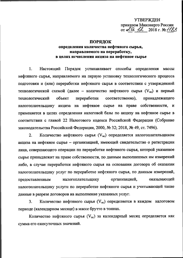 "ОБ УТВЕРЖДЕНИИ ПОРЯДКА ОПРЕДЕЛЕНИЯ КОЛИЧЕСТВА НЕФТЯНОГО СЫРЬЯ, НАПРАВЛЯЕМОГО НА ПЕРЕРАБОТКУ, В ЦЕЛЯХ ИСЧИСЛЕНИЯ АКЦИЗА НА НЕФТЯНОЕ СЫРЬЕ"