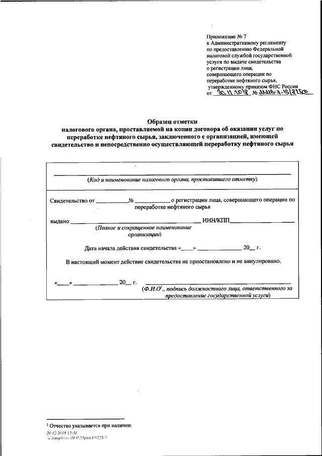 "ОБ УТВЕРЖДЕНИИ АДМИНИСТРАТИВНОГО РЕГЛАМЕНТА ПО ПРЕДОСТАВЛЕНИЮ ФЕДЕРАЛЬНОЙ НАЛОГОВОЙ СЛУЖБОЙ ГОСУДАРСТВЕННОЙ УСЛУГИ ПО ВЫДАЧЕ СВИДЕТЕЛЬСТВА О РЕГИСТРАЦИИ ЛИЦА, СОВЕРШАЮЩЕГО ОПЕРАЦИИ ПО ПЕРЕРАБОТКЕ НЕФТЯНОГО СЫРЬЯ"
